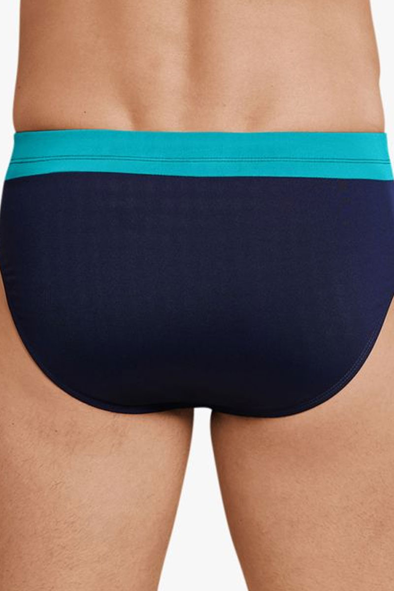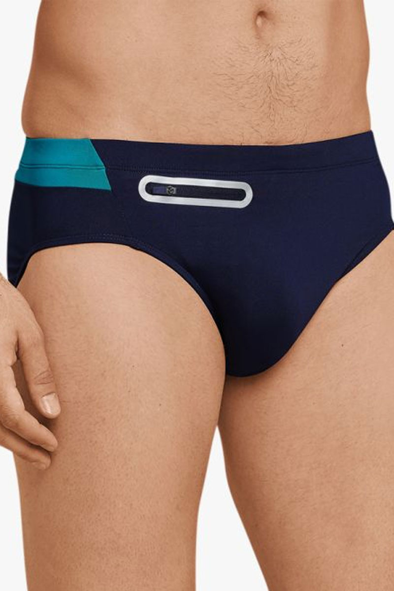 Mooie blauwe zwemslip van Schiesser. De zwemslip is donkerblauw van kleur en hij heeft een handig zakje met ritssluiting aan de voorkant. Om deze ritssluiting zit een opvalende zilveren rand. De tailleband is lichtblauw aan de achterkant.