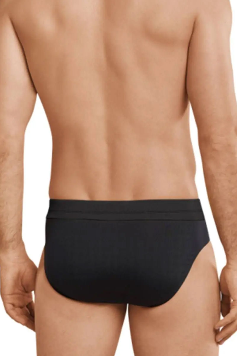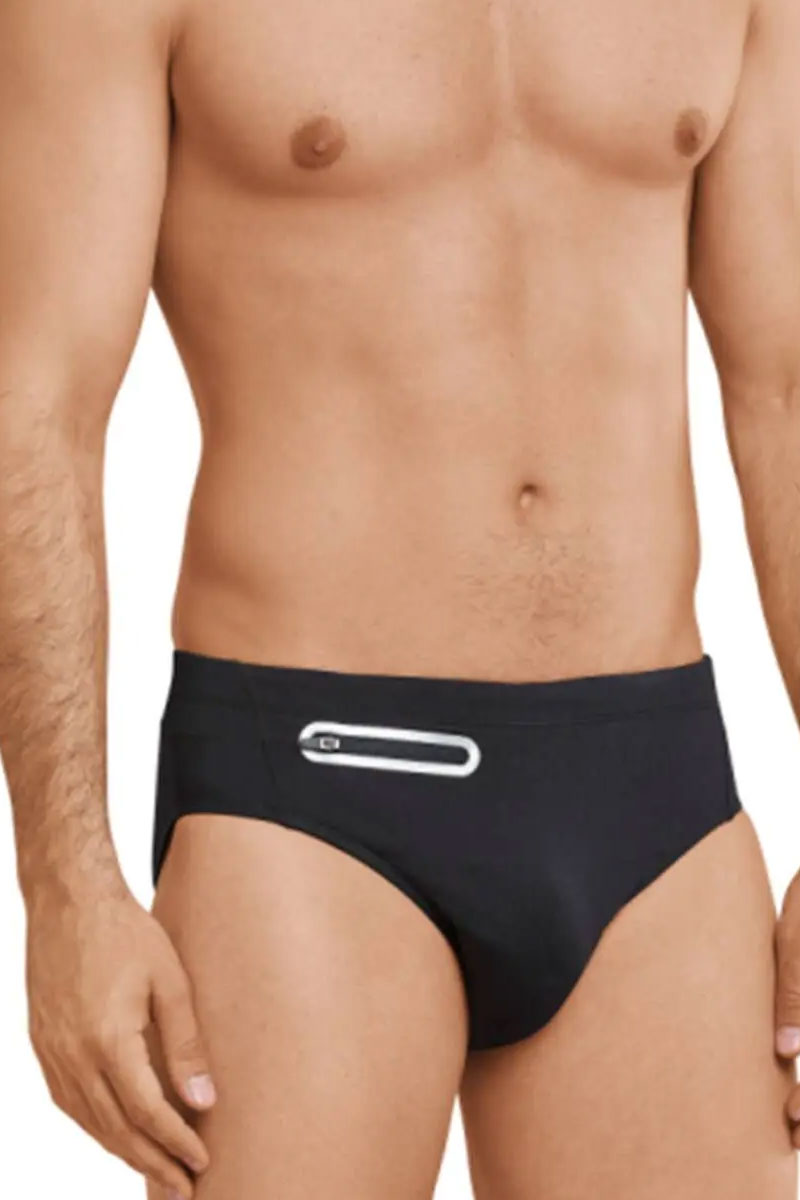 Mooie zwarte zwemslip van Schiesser. De zwemslip is zwart van kleur en heeft een handig zakje met ritssluiting aan de voorkant. Om deze ritssluiting zit een opvalende zilveren rand.